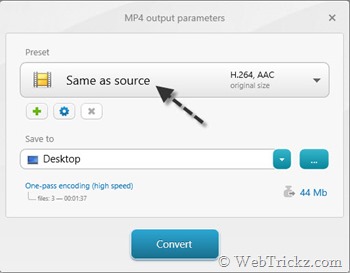 4. Then choose the output video format which could be same as the input video format. In output video parameters, let preset be ‘Same as source’ or choose a custom one.